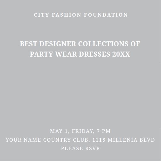 CITY FASHION FOUNDATION BEST DESIGNER COLLECTIONS OF PARTY WEAR DRESSES 20XX MAY 1, FRIDAY, 7 PM YOUR NAME COUNTRY CLUB, 1115 MILLENIA BLVD PLEASE RSVP